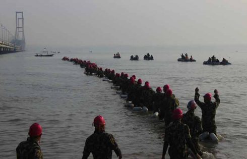 Tradisi Pasmar-1 Korps Marinir merenangi Selat Madura yang melibatkan 2016 prajurit, Kamis (28/4/2016), langsung tercatat…